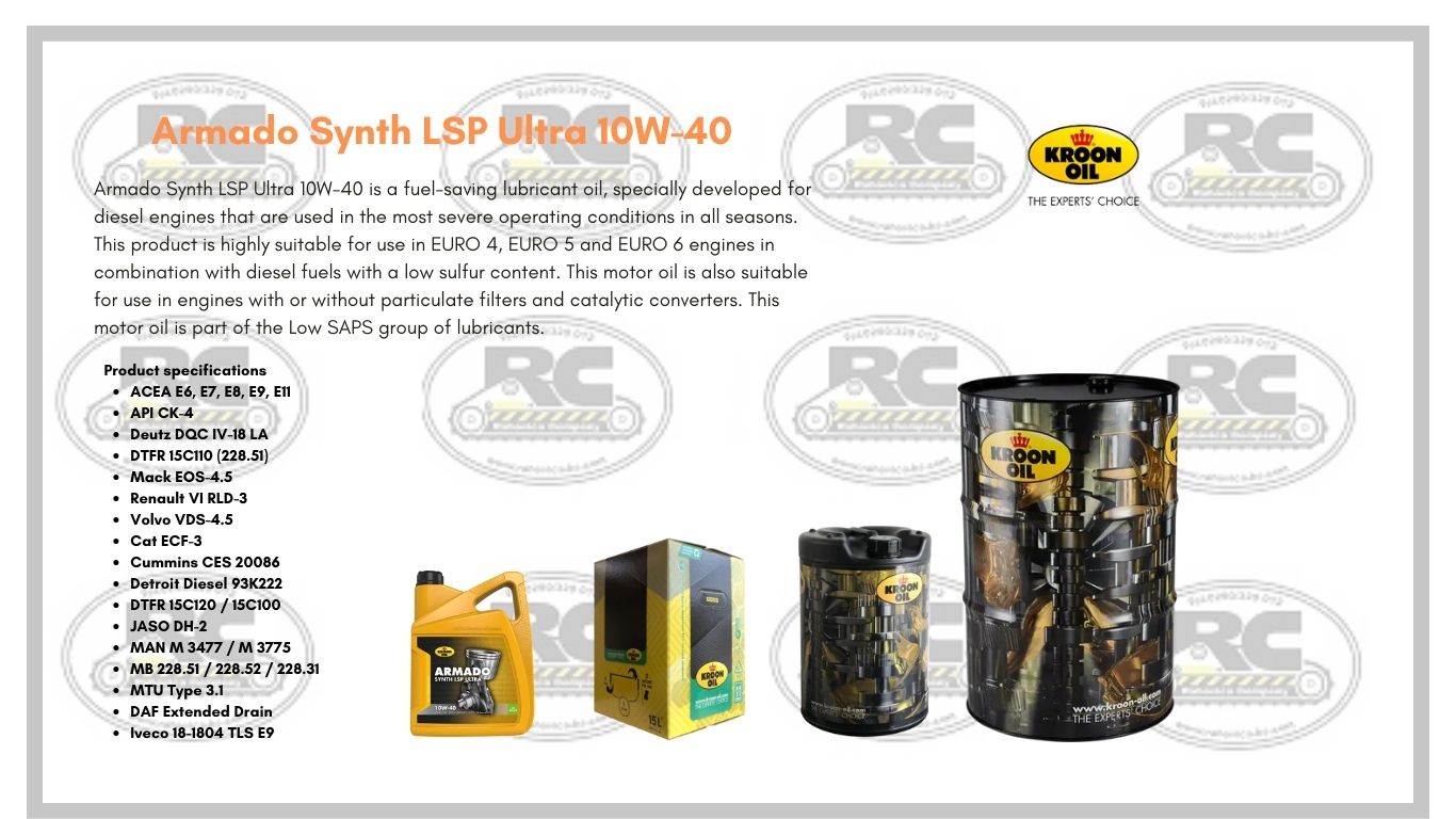 Armado Synth LSP 10W-40 is a fuel-saving lubricant and has been specially developed for diesel engines under the most severe operating conditions in all seasons. This product is very suitable for use in EURO 4 and EURO 5 engines in combination with diesel fuels with a low sulphur content. This engine oil is also suitable for use in the so-called EGR engines, with or without particle filters. This engine oil belongs to the group ‘Low-SAPS’ lubricants.